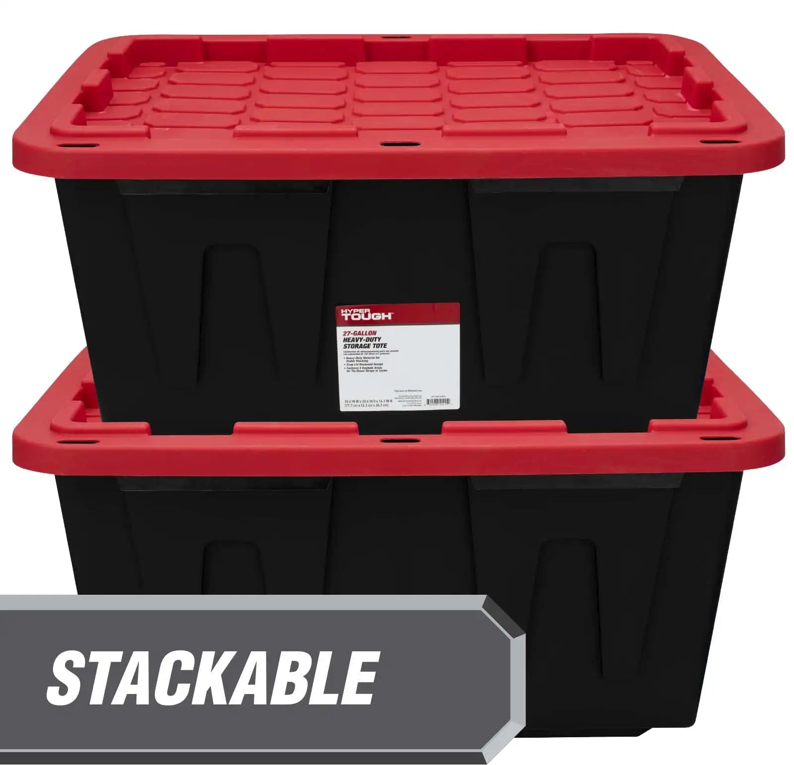4 Pack, 27 Gallon Large Storage Bin, Plastic Storage Container with Stackable Snap-On Lid, Black and Red