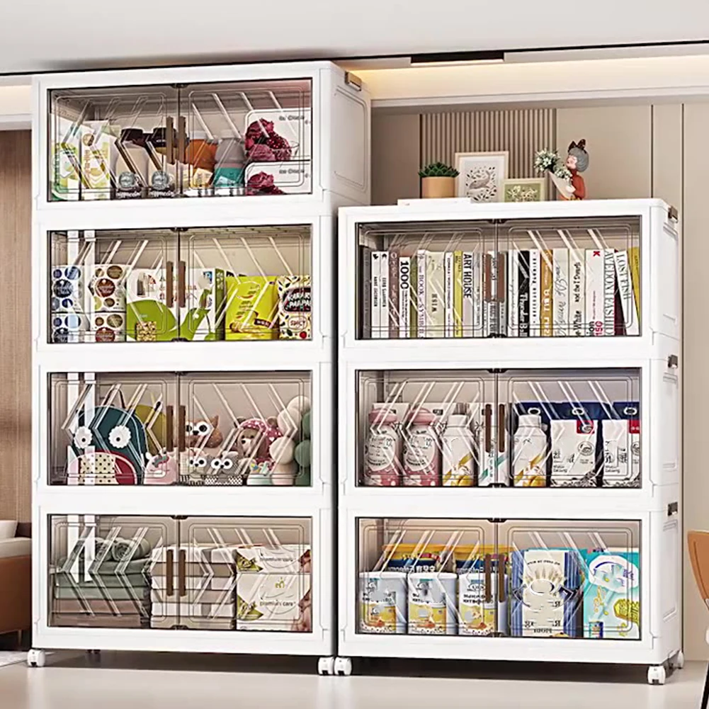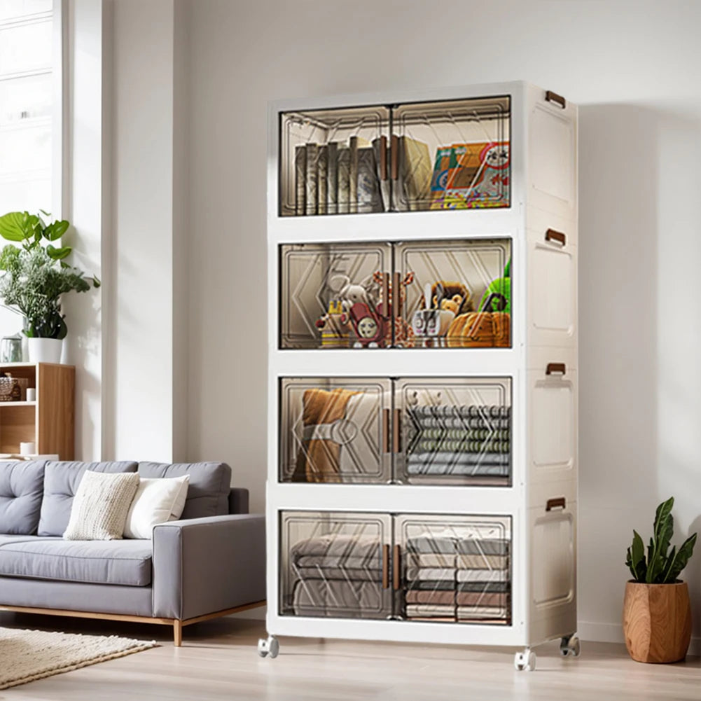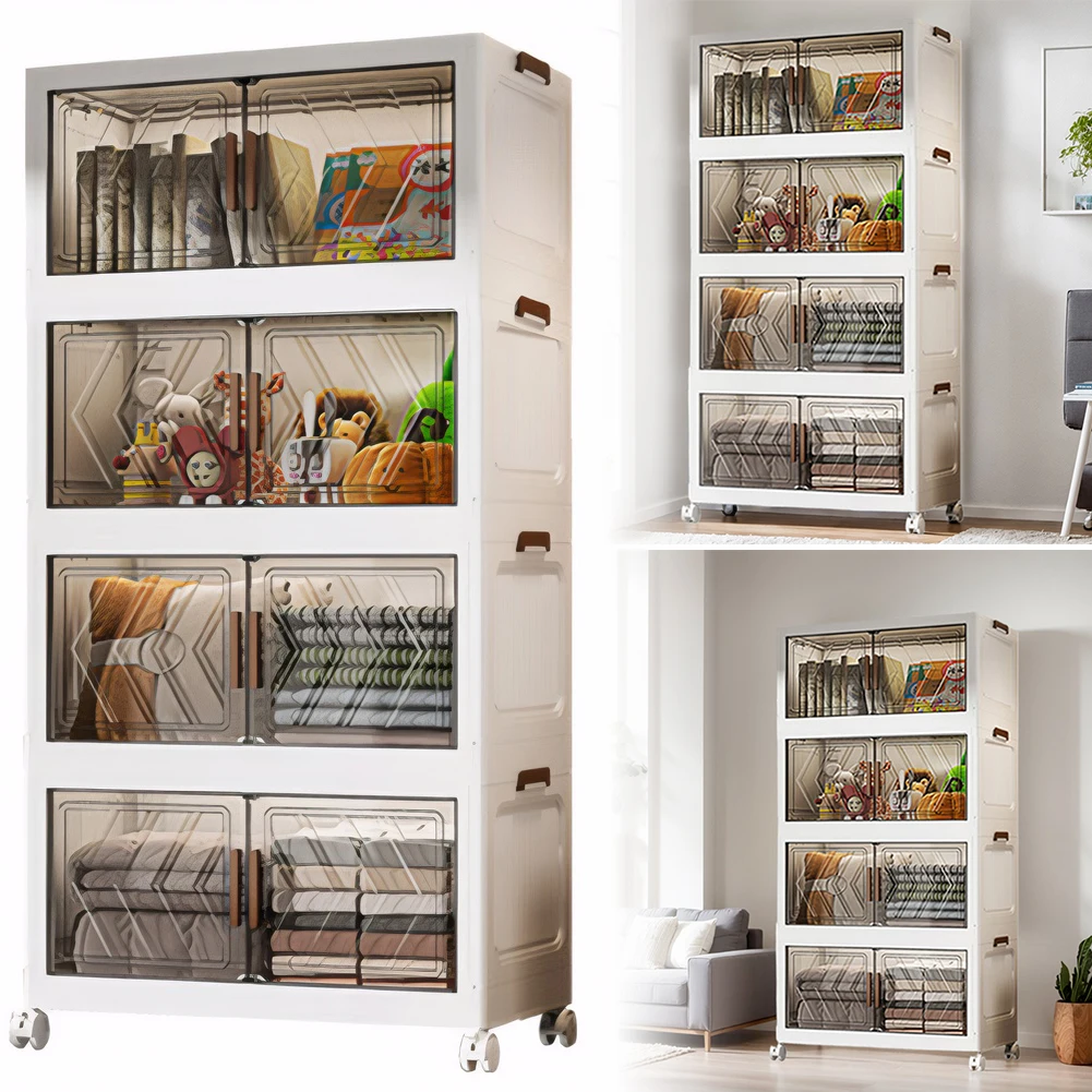 4 Tier Plastic Storage Containers with Doors & Wheels Folding Storage Boxes Folding Storage Cabinet Shelf for Home Office Dorm