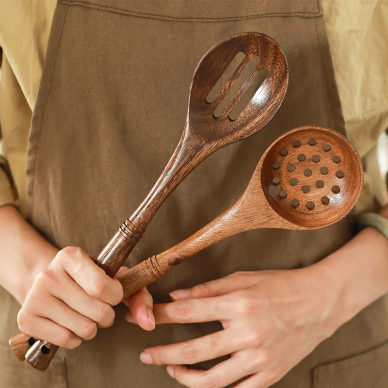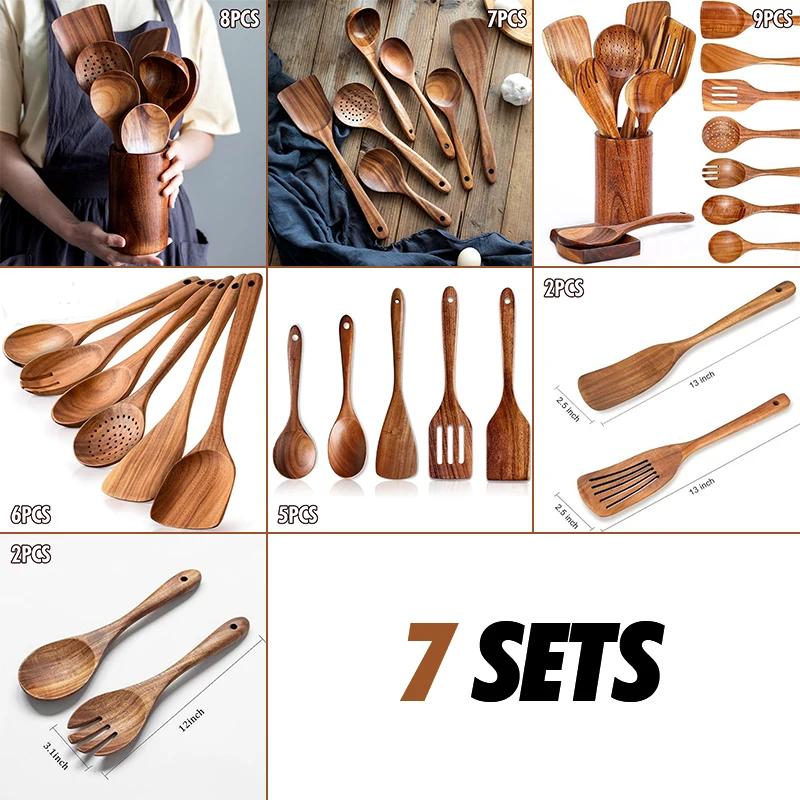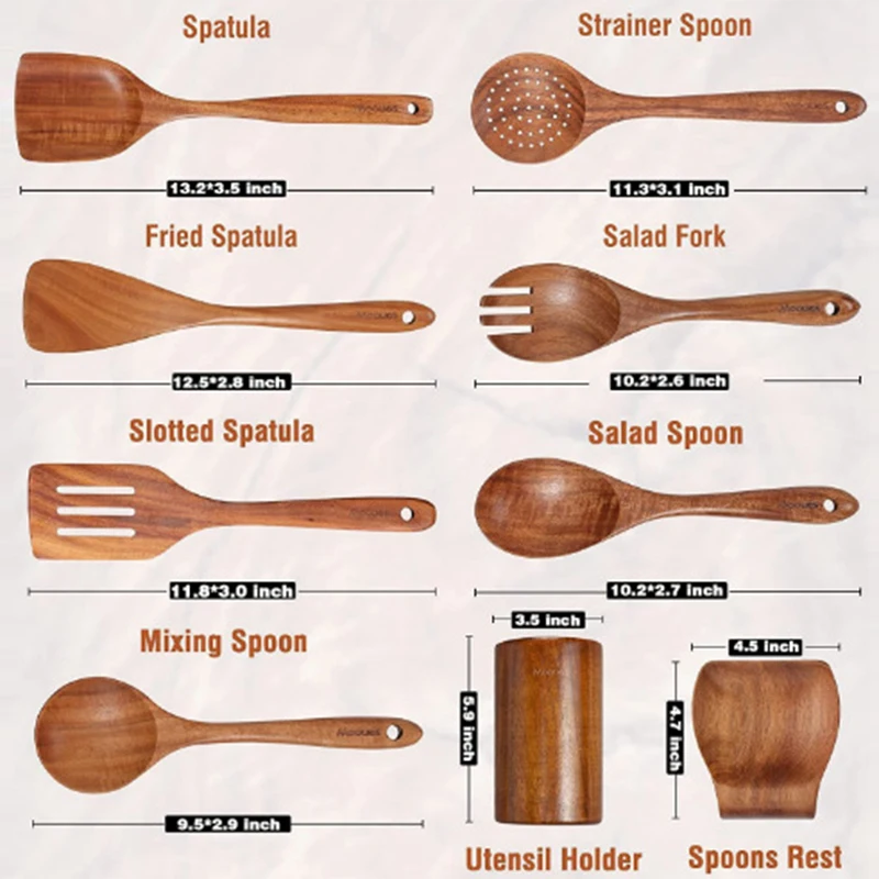 Natural Wood Kitchen Utensil Set Eco-Friendly Cooking Tools incl Skimmer Spoon Salad Scoop Non-Stick Rice Colander for Soup