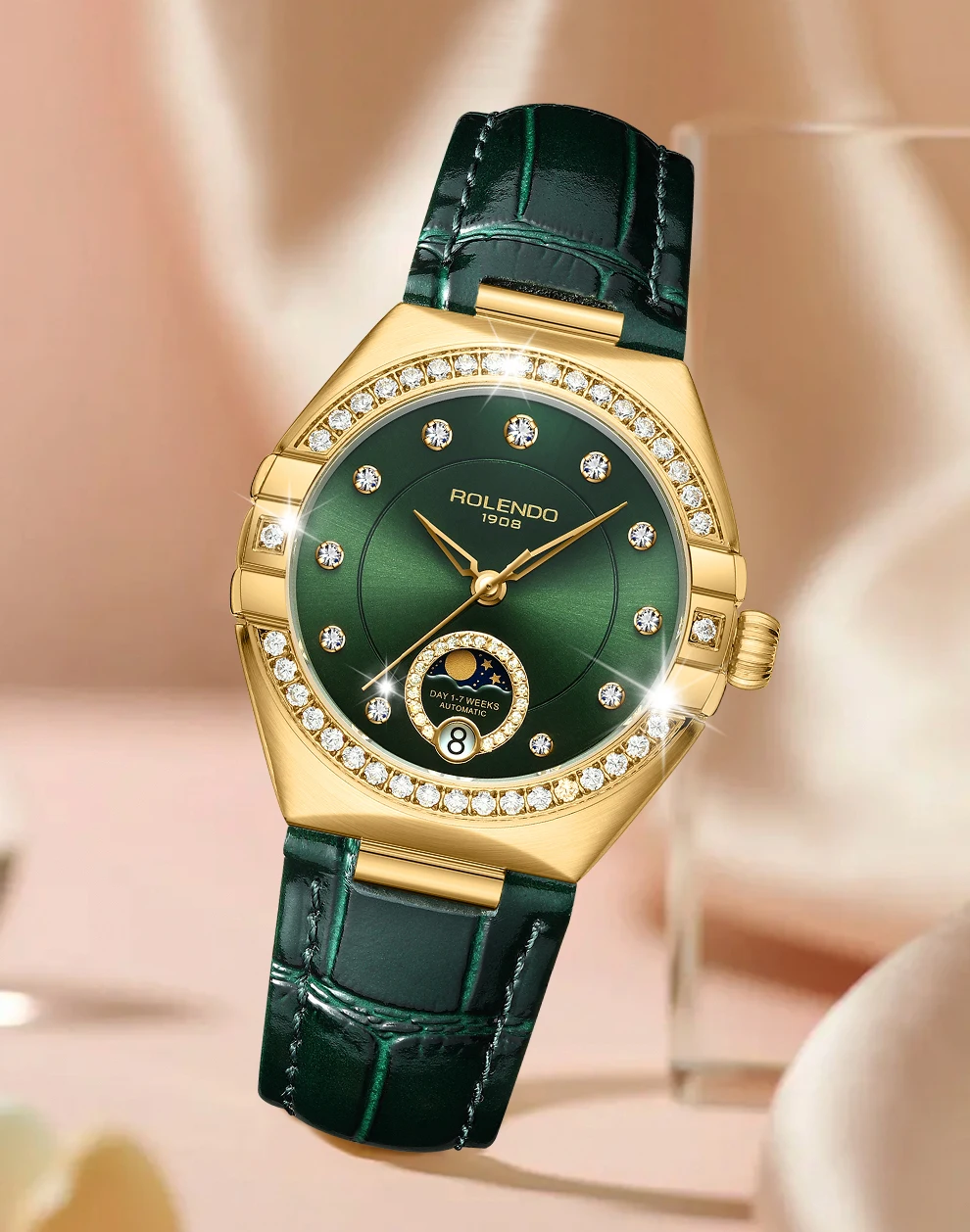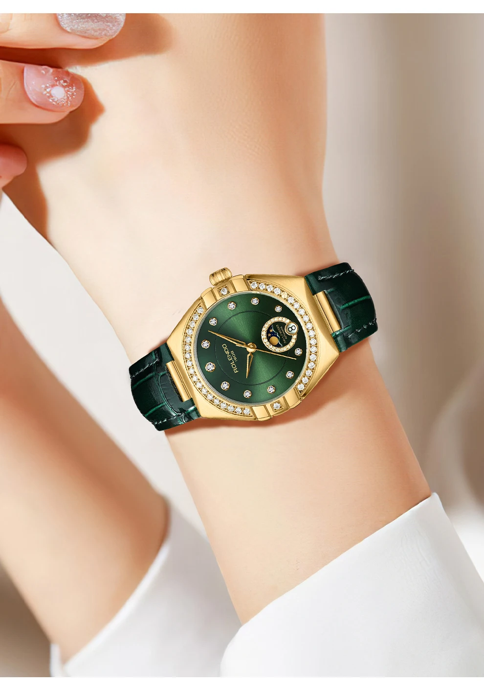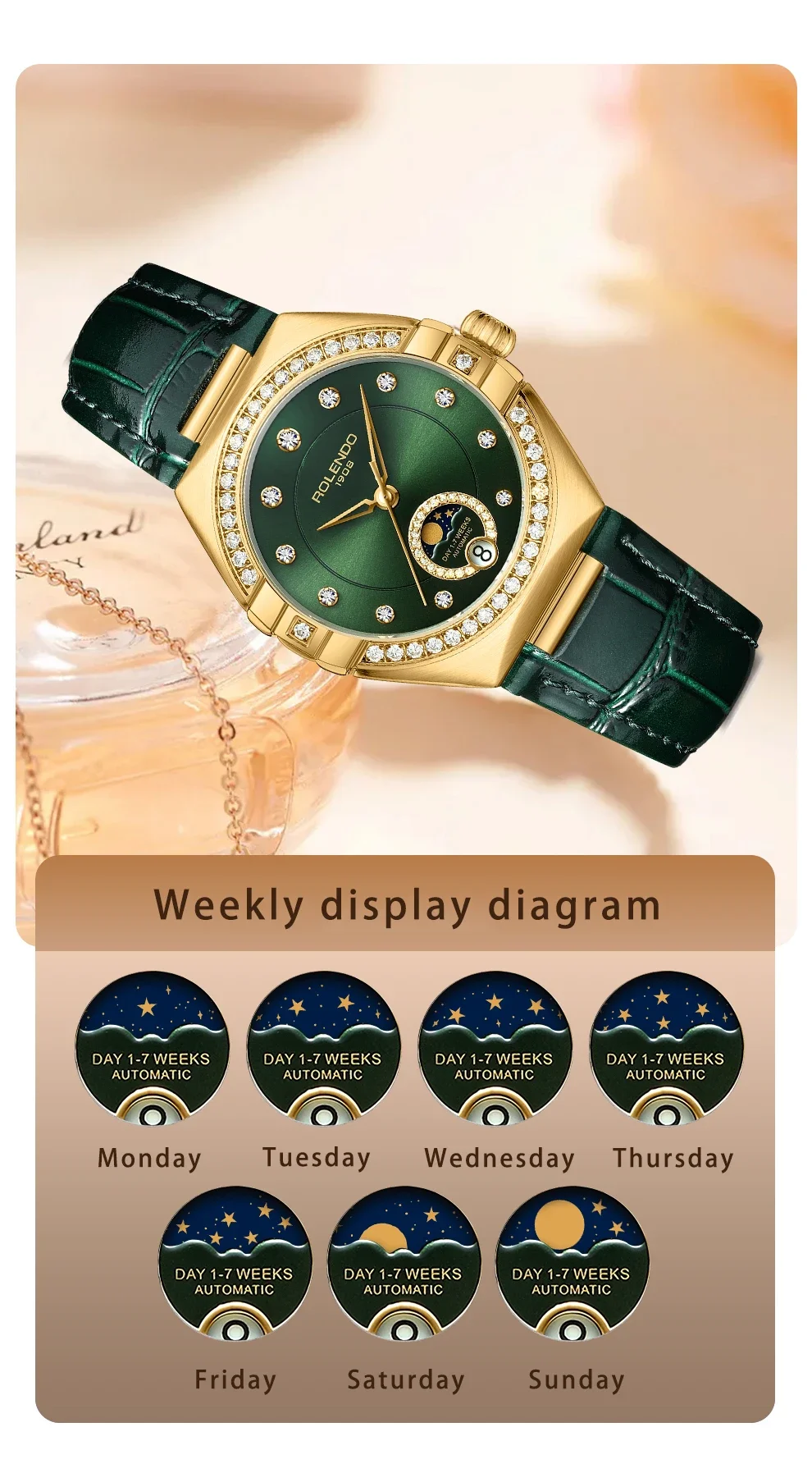 ROLENDO Constellation Style Automatic Women's Watch Secret Emerald Strap Green Dial Day-Date Sapphire Crystal Waterproof Elegant
